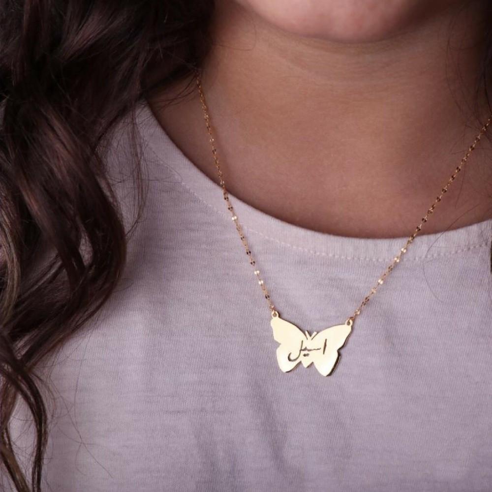 عقد بتصميم الفراشة مع إضافة الإسم يتم صياغة الاسم حسب طلبك .. وذلك بأيدي صائغين مهرة في المصنع الخاص بـ ساندي