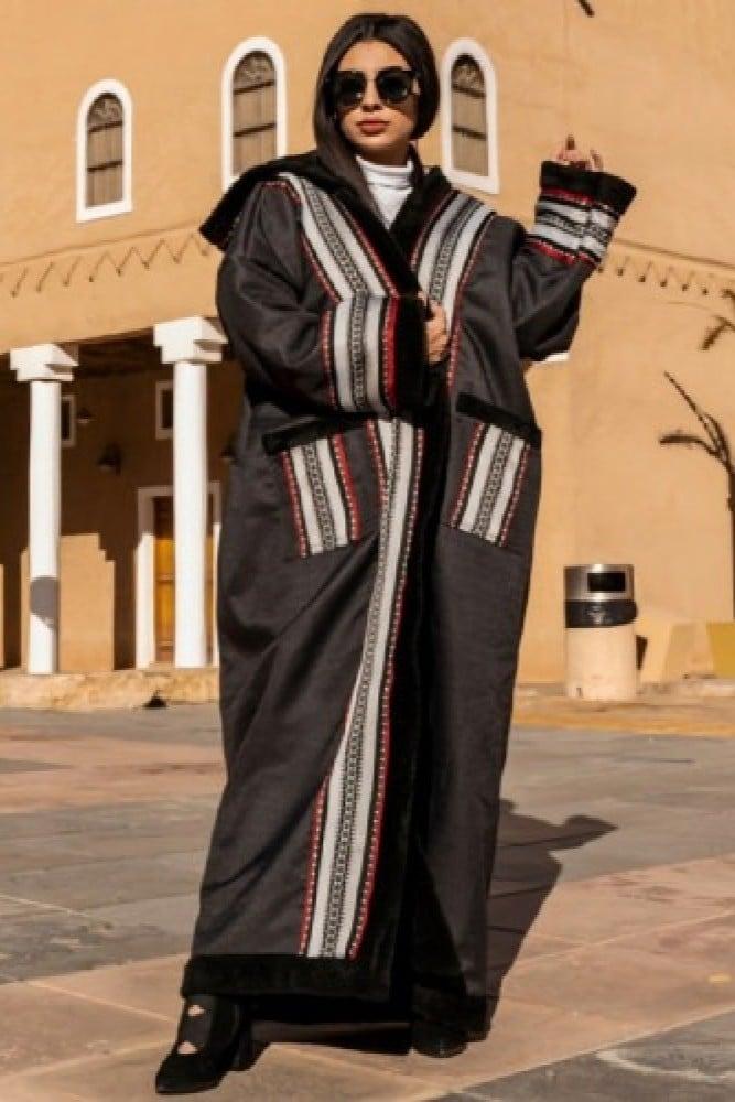 فروة شتوية أنيقة ودافئة مصنوعة من أفخم أنواع الفرو والقماش الصوفمخططه من اطراف تطريز تراثي فرو اصلي.قماش صوف.وبمكاننا ننحت عليه الذي تبي وباي لغه تفرد في ملابسك الشتويه مع ساندي